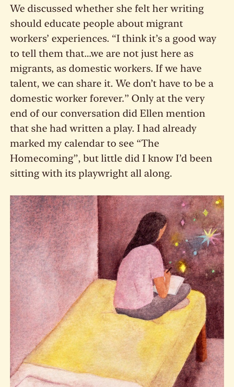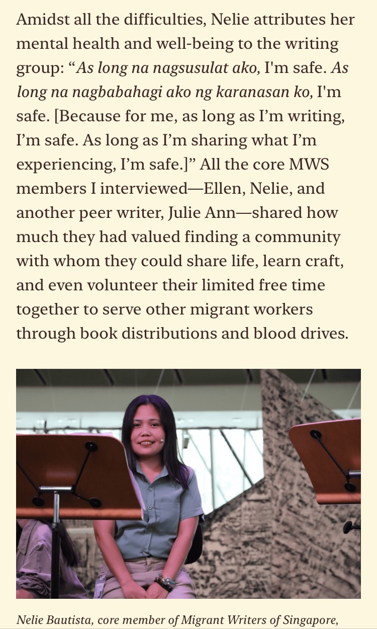 I share the excerpts above that include photos of Ellen, Nelie, and their peers, because they are the true beating heart of the story. At its core, I had always wanted the piece to be a human-interest story first, not an educational one. But if you read Jom’s own posts on social media that pushed the piece (like this one on LinkedIn and on Instagram), you get a sense of the opportunity the publication had to situate the story within the context of a much larger development of migrant writing as a movement locally and beyond the region. As such, if you were to only read the bits and pieces of the essay as circulated on social media, one might get the sense that this was a much more academic pursuit.