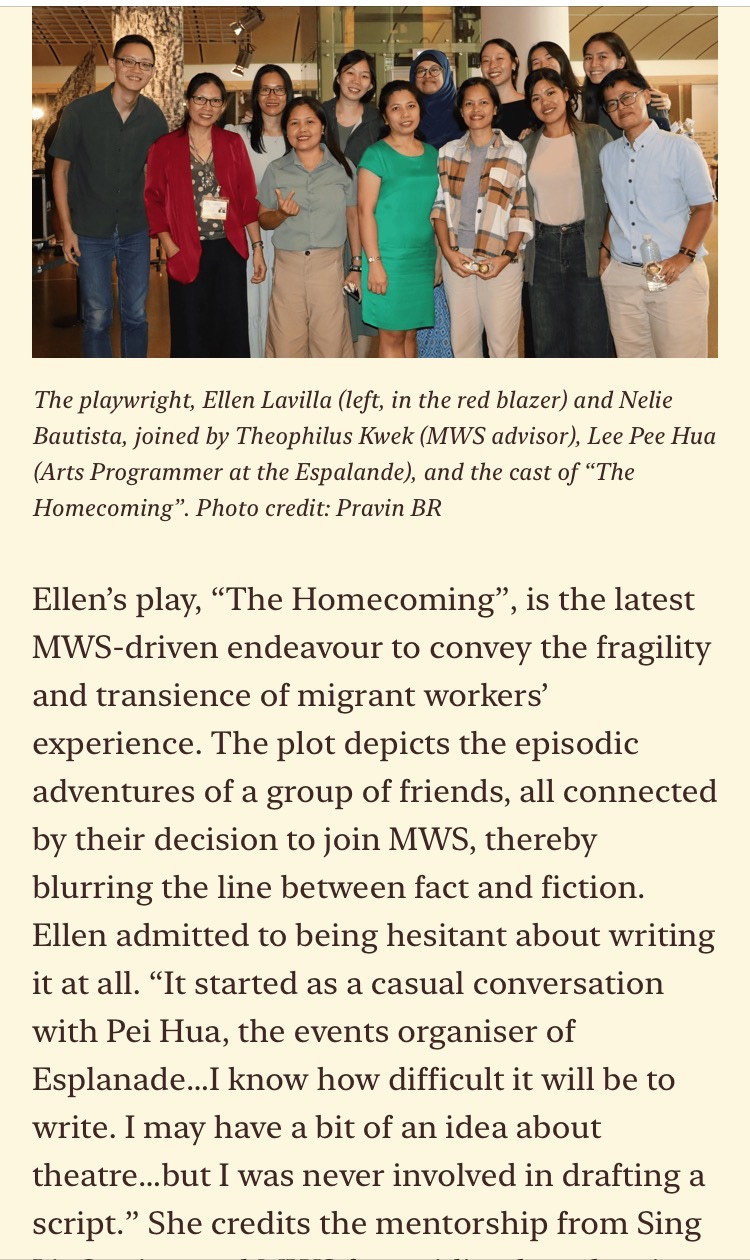 This was a quote from Ellen Lavilla, whom I interviewed for the story I wrote, Flipping The Script: Migrant Writers of Singapore. The title is a play on words, as Ellen had written the script for "The Homecoming", a play that displayed how complex community building can be for transient migrant workers pulled by the longing--and responsibility--to return home. Ellen is a writer and is herself a core member of the group. She has worked in Singapore for over two decades.